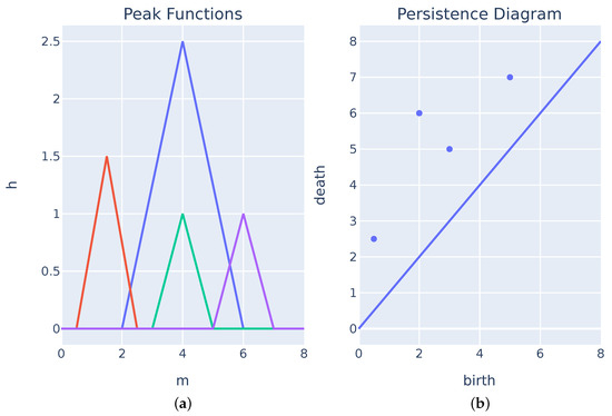 Persistent Diagram and its respective peak functions. (a) Peak function from the computed piecewise function (Equation (6)). (b) Persistent Diagram for the point cloud .