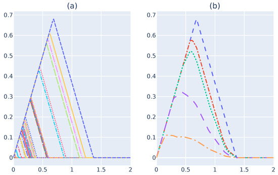 This entire work focus on building Persistent Landscapes for barcodes obtained by performing a 0-dimensional persistent homology analysis. There a few aspects in this dimension that are useful to pay attention to. Such aspects that facilitate Persistent Landscape building in an RSES, Figure 3a illustrates the peak function drawn from a 0-dimensional barcode. As one can see, the peak functions share the left side of the triangle. The reason for such behavior is because, in , every single point is a connected component, which means that every simplicial component is born at 0.