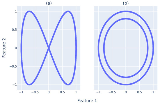 Graphical depiction of the point clouds used for testing. (a) Infinity sign point cloud. (b) Two circle point cloud. Each point cloud has 2000 points.