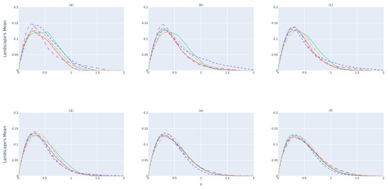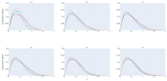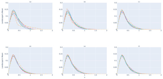 Figure 5a illustrates the for -devices when a single landscape is considered. It is expected that the amount of information provided from a single landscape will not represent the dataset, because the number of samples selected is small due to the memory constraints of an RSES. As shown, values do not yet converge to the same shape. By increasing the number of landscapes to obtain , Figure 5b,c, shows better convergence to a single line. This convergence happens when 32 barcodes/landscapes are considered for , as illustrated in Figure 5d. Nevertheless, considering more landscapes, as shown in Figure 5e,f, makes the results for each device almost indistinguishable. These results show that a single landscape does not provide enough information to verify whether the data collected follow the same structure. One should consider and study the minimum number of landscapes to use before stating that .