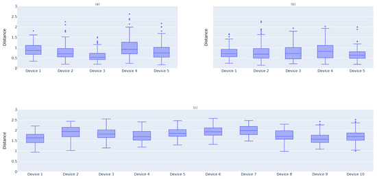 Figure 8a presents the distance results for the devices. The box plot clearly shows that the majority of values for these devices are under 1. Therefore, one may consider that the correct value is . Now, one may look at Figure 8b, which plots the distance for the devices. Since these devices are collecting the same data as , one must verify whether is a suitable value to use for a threshold. As one can verify, the vast majority of devices have , which is a good result. Finally, one must verify whether the same could discard the results from devices. Figure 8c shows that most d values for are above 1. Thus, if one selects , the main intention to cut off the results from devices is achieved.