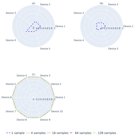Figure 9 depicts the flag rate from generating 10,000 sampling groups from the previous landscapes obtained for each . The groups were randomly generated and composed of 1, 4, 16, 64, or 128 landscapes. As one can see, using a single landscape (blue dashed line), the flag rates for both and -devices were high and in some cases were above 20%, as shown in Figure 9a,b. For cases with 4 landscapes, the flag rate can be up to 5%, which is still a high result. With 16 landscapes, a residual number of landscapes was obtained for the flagged and devices, which is the expected behavior for the system. Contrary to this, Figure 9c illustrates that, even with a single sample, the system can identify the -devices. However, because of the flag rates of the and -devices, one must choose to use 16 or more landscapes for identification.
