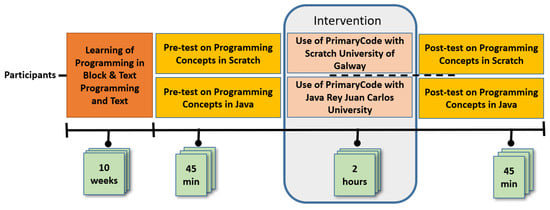 Based on the principles of research-based learning, the didactic research method for computing education used in this study was created to foster students’ foundational programming concepts for the development of CT skills. There was a quasi-experimental pre- and post-testing protocol used. The same evaluation measures were used for both the pre- and post-tests conducted to assess programming concepts in seven introductory programming lessons. However, in one group, the concepts were taught using block programming (Scratch) at the University of Galway, Ireland, while in the other group, text programming (Java) was utilized at the University Rey Juan Carlos of Madrid, Spain. After 10 weeks of learning programming in both block and text programming, in both settings, teachers’ students took a pretest on their initial knowledge. Subsequently, they utilized the VEE PrimaryCode tool at their own pace for the duration of the learning period. Following the completion of the programming curriculum, the students took a post-test to evaluate their progress and understanding. Each test was completed individually by each student at their respective location. Figure 4 shows the diagram of the experimental design that followed.
