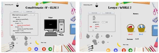 Each lesson was meticulously designed with the intention of promoting effective concept assimilation. The instructional approach followed a sequence wherein the execution of the script was first demonstrated on the left side of the screen. This was followed by a visual representation on the right side, showcasing various elements such as memory boxes or trunks, the PC screen, and an array depicted as a fruit box, among others. Furthermore, the lessons incorporated multiple exercises and scripts, providing students with the opportunity to engage with different inputs. These inputs were conveniently accessible in the lower left corner of the screen. Figure 5 shows two examples of script executions in Java, for conditionals and loops, respectively. In both the script and the visual part, through the combined interaction with the different inputs, the scripts offer instant feedback, enabling assimilation and accommodating new ideas in Java (Figure 6) and Scratch (Figure 7).