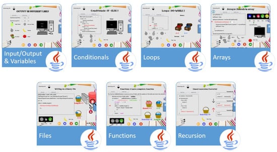 The PrimaryCode (https://sites.google.com/view/primarycode-v3-english/inicio?pli=1 (accessed on 24 May 2023)) visual execution environment (VEE) proposed in this paper utilizes pre-established Java or Scratch programs for each of the proposed lessons. It is a Java-based application that can be installed on any PC (independently of its operating system). Using pre-established coding environments, such as this one, prevents syntax errors, and there is a guide to cover programming concepts incrementally (from easy to difficult). Such environments make novice programmers feel confident while learning.