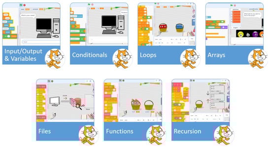 - Ouahbi, I.; Kaddari, F.; Darhmaoui, H.; Elachqar, A.; Lahmine, S. Learning Basic Programming Concepts by Creating Games with Scratch Programming Environment. Procedia-Soc. Behav. Sci. 2015, 191, 1479–1482. [Google Scholar] [CrossRef]