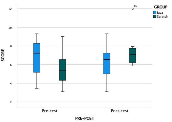 Figure 8 shows box plots for the Java and Scratch groups, visually confirming what was said above.