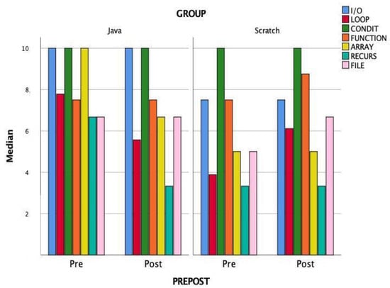 In the case of the Scratch group, the mean and median increase in all cases, especially in files, loops, and functions. The standard deviation has similar behavior in the Scratch group. Figure 9 visually represents these results, highlighting, in this case, the median, the measure of centralization chosen due to the asymmetry of the data.