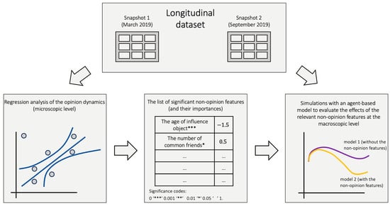 Our analysis builds upon a longitudinal dataset that describes the opinion dynamics of a sample of online social network users. We use this dataset to investigate what factors govern opinion dynamics at the microscopic level. Using regression analysis, we discern statistically significant covariates (paying specific attention to non-opinion ones) and compare their effects. Those factors that are estimated to be significant are then employed in simulations with an agent-based model. These experiments are focused on comparing two models: in the first one, the non-opinion features are not accounted for. In contrast, the second model includes the non-opinion features. Both models are calibrated on the empirical data. We check the outcomes of these two models at the macroscopic level—our main objective is the public opinion states predicted by the models. The schematic representation of our analysis is presented in Figure 1.