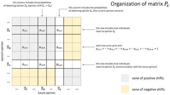 We demonstrate the organization of the matrix  for a fixed . Each of its rows sums up to one as it covers all possible alternatives. Let us consider the -th row that outlines how individuals with opinion  react to opinion . Overall, there are  possible alternatives: . The resulting estimated probabilities of these alternatives are described by the quantities . Other rows are elaborated analogously. We would like to emphasize that row  stands for the situations when the influence comes from the coherent opinion , whereas column  contains the probabilities of holding the current opinion . In this regard, the elements of the -th column (the quantities ) represent how stubborn are individuals with opinion . According to the previous empirical research [,,], we should expect that this column will dominate the others. In matrix , the components standing for positive and negative opinion shifts are easily located. The zone of positive shifts is defined as follows: , where  and  are the row and column indices, respectively. In other words,  is the union of the second and fourth “quadrants”, given that the origin of coordinates is located at  (the component ). Correspondingly, the zone of negative shifts is the union of the first and third “quadrants”: .