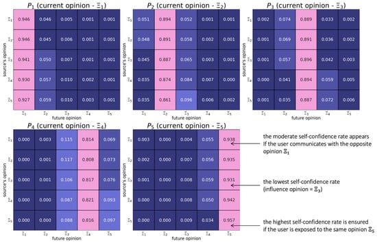 We first need to answer the following question: given the opinions of two befriended users at time , can their opinions at time  be predicted? To answer this question, we discretize the opinion scale  into aggregated opinion values , and then the probabilities of all possible opinion changes  (including static ones ) are computed across all possible influencing opinions . These probabilities are captured by the quantities , where for given  and , variable  measures the probability that opinion  will be changed to  after being influenced by opinion  (see Appendix A for details on their computation). The quantities  can be informatively grouped into  square row-stochastic matrices , where  for a fixed  showcases how users with opinion  react to peers’ opinions. Organization of matrix  is schematically presented in Figure 2. In Figure 3, we depict the values of  estimated from our empirical data. Within such an encoding strategy, in matrix , the -th column contains the self-confidence rates of users with opinion  across different values of the influence source opinion. From Figure 3, we conclude that: