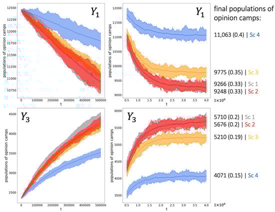 The figure demonstrates the averaged dynamics of the populations of leftists (upper panels) and rightists (bottom panels) across Scenarios 1–4 (marked with different colors). For each Scenario, the colored area is formed by the upper and lower contours of the corresponding simulations, and the curve represents the trajectory averaged over simulations. The left panels depict the time span ; the right panels investigate the range . The final populations of leftists and rightists are depicted on the right side of the figure in absolute and normalized (in brackets) values.