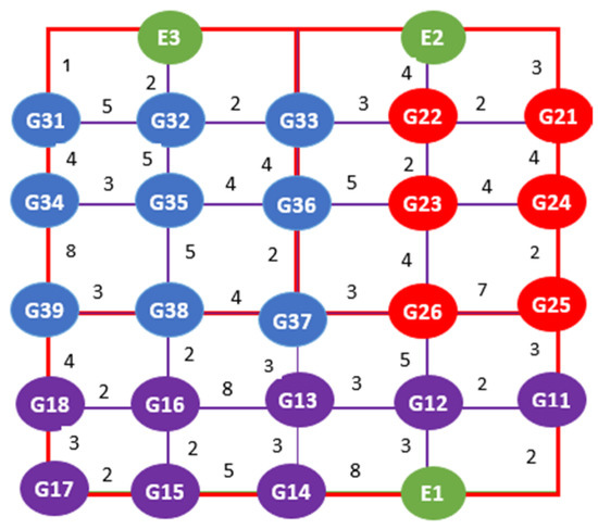 Figure 2 illustrates lounge 5 represented by Guideleader5. Room 5 has three areas, A51, A52, and A53. Area A51 has exit E1 and is represented by Guide51, with passenger groups G11 to G18. Area A52 has exit E2 and is represented by Guide52, with passenger groups G21 to G26. Area A53 has exit E3 and is represented by Guide53, with passenger groups G31 to G39. The evacuation plan is executed in the three areas, with the order of movement for each group based on the distance to their area’s exit. In area A51, groups move in the order of G11, G12, G14, G13, G15, G16, G17, and G18 with corresponding distances to exit E1 of 2, 3, 6, 8, 13, 14, 15, and 16, respectively. In area A52, groups move in the order of G21, G22, G23, G24, G25, and G26 with corresponding distances to exit E2 of 3, 4, 6, 7, 9, and 10, respectively. In area A53, groups move in the order of G31, G32, G33, G34, G35, G36, G37, G38, and G39 with corresponding distances to exit E3 of 1, 2, 4, 5, 7, 8, 10, 12, and 13, respectively. Each group follows the shortest path guided by their respective group leaders.