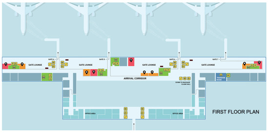 Passenger distribution data in the lounge are based on the distribution ratio in the document [28]. The distribution of passengers enters the lounge three times, 6:00 a.m., 10:00 a.m., and 6:00 p.m., within the time of 2 h and 50 min to 1 h before takeoff. We assume that approximately 300 passengers are distributed to each lounge based on the passenger distribution ratio at 6:00 a.m., and the location of each passenger is randomly assigned.
