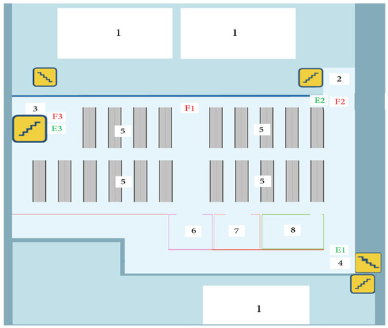 The impact of fires on the evacuation process [17,18,19,20], and the characteristics and behavior of humans during evacuation [21], has been tested. In [22], the authors focused on evacuation plans for buildings with multiple escape routes based on a network model of indoor pathways. According to [23], the authors proposed an agent-based model that provides a framework for exploring individual, social, and technological aspects in crowd evacuation.