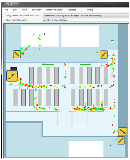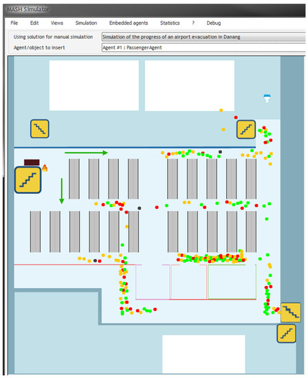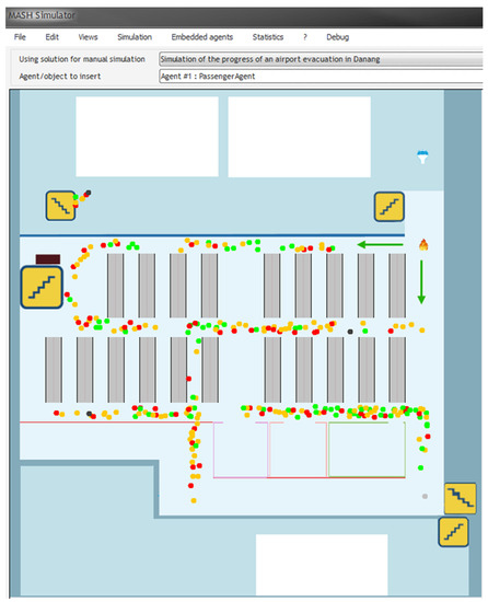 We experimented with the proposed method based on the simulation framework MASH [25]. Based on this framework, we developed the application, implemented the program, and conducted experiments on the problem of passenger evacuation at the departure hall, first floor, Danang International Airport, Vietnam (Figure 3).