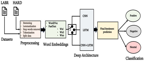 Sentiment analysis can be conducted at many different levels, such as document level, sentence level, and aspect level [6,7]. This study employs sentence-level sentiment analysis on two Arabic datasets to evaluate whether the review’s polarity is positive, negative, or neutral. The limited research on the Arabic language is due to its ambiguity, morphological complexities, various dialects [8], the unavailability of accurate pre-processing tools, and the shortage of its dataset resources [9]. The two techniques that can be used for the SA are the lexicon and machine learning-based techniques. The lexicon- or corpus-based technique uses a dictionary that contains words and their corresponding polarities [10], whereas machine learning-based techniques require a massive labeled dataset with manual annotation [11]. Deep learning’s (DL) success in a variety of fields, including computer vision, reveals its use in the field of natural language processing [12,13,14]. Because DL does not use feature engineering to learn continuous text representations from data, it outperforms traditional machine learning. With the use of various word embedding approaches, deep contextual properties of words are extracted in a lower-dimensional space [15]. For NLP, many DL approaches are used, such as convolutional neural networks (CNNs) [12,16] and long short-term memory (LSTM) [17]. Although such DL techniques are frequently applied to English corpora, Arabic Sentiment Analysis deep learning models are not getting as much attention [18,19,20].