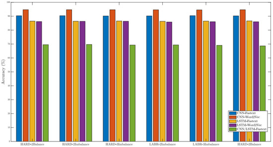 For the HARD dataset, many studies were conducted based on classical machine learning [37,38]. For instance, a triple combination of N-gram features with PCA and LDA was used for feature selection [37]. Furthermore, several supervised classifiers were tested, such as DT, RF, bagging, NN, NB, boosting, and logistic regression (LR). The experiments were conducted for binary and multi-class classifications. As for deep learning, a study by Muaad et al. [39] developed a novel deep learning Arabic text computer-aided recognition (ArCAR) for character level instead of sentence level. The proposed model was based on CNN with six layers and two fully connected layers. The experiments were conducted on various datasets, including the HARD binary classification with balanced data and three classifications with imbalanced data. The accuracy for the two datasets was 93.58% and 93.23%, respectively.