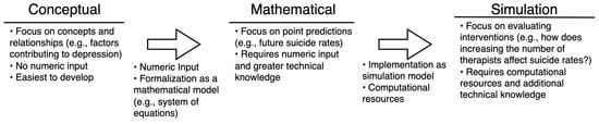 As a result of the strong track record of M&S in addressing public health challenges, modelers have contributed to suicide prevention efforts on several occasions. Specifically, three types of models have been utilized. First, conceptual models such as concept maps and networks (i.e., graphs) that focus on identifying key concepts and relationships in the problem space instead of making point predictions (i.e., predicting future values under different scenarios) have been used to model the complex factors and relationships contributing to adolescent suicide [36,38,39], evaluate protective factors (e.g., social support) [40], and examine the role of anxiety and depression in suicidal thoughts [41]. Second, mathematical models (e.g., systems of differential equations) that represent the current system have investigated the spread of suicide in Greece [42] and predicted suicide rates in the United States, Brazil, and Sri Lanka [43]. Third, simulation models such as Agent-Based Models and System Dynamics have been applied to support regional suicide prevention planning in Australia [44], reduce youth suicide [45], and examine the potential effects of reducing access to firearms for those with drug and alcohol-related misdemeanors on firearm-related suicide deaths [46]. In summary, the three types of models are on a continuum (Figure 1). Every model starts as a conceptual model, as modeling teams need to identify relevant factors and their interactions. If a modeling project needs and uses numerical data (e.g., suicide rates), it becomes a mathematical model. If equations cannot be solved in closed form, the model needs to be simulated using a computer implementation, becoming a simulation model. In this paper, we focus on simulation models, as they provide actionable tools for evaluating the effects of potential interventions.