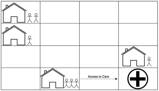 An example ABM depicting agents, their connections, and their access to care. Agents that are farther away have greater difficulty in accessing care.