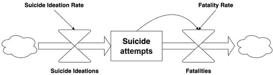 A simple System Dynamics model diagram for determining the number of suicidal ideations (i.e., suicidal thoughts).