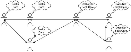 Agent-Based Models (ABM) investigate how individual behaviors and interactions can produce system-level patterns and how individual differences affect the emergence of such patterns [52]. This approach has been used on many occasions to model complex health behaviors [53,54], and is one of the predominant systems science approaches in public health [55]. This approach consists of three main components: agents, interactions among agents, and interactions between agents and their environment. Agents (Figure 2) represent a person, firm, or entity capable of interacting with other agents and the environment [52,56]. First, the agents’ personal attributes (e.g., age, income, and ethnicity) and behavioral rules affect their progression through the model and interactions with their environment and other agents. Agent-based modeling is a bottom-up process, as modelers define the agents and these interactions at the micro-level, then run simulations to observe the emergence of macro-level phenomena such as suicide clusters [57,58]. Agents may be equipped with goals (e.g., death by suicide), make decisions (e.g., plan to acquire and use a specific type of means of suicide), and learn behavior from their past experiences and other agents (e.g., one friend died by suicide using a specific means). Second, each agent has a social network detailing the nature (i.e., who has social ties with whom?) and function (i.e., what happens through each tie and when does it happen?) of interactions with other agents. For example, this allows the model to spread social norms or behaviors, such as when an agent is depressed and increases the odds of depression for other agents depending on the strength of their relationships. The structure of agents’ social networks can change as the simulation progresses and as agents change states, behaviors, and locations. For example, an agent may move between locations, weakening or removing certain connections in its social network. Third, each agent has a physical location in the model, which can affect the agent’s access to resources (e.g., mental health treatment) and states and may constrain their social networks.