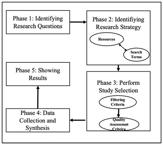 The research methodology of this systematic literature review was designed as a protocol-based process. The process was adopted from the medical domain and redesigned and adapted to software engineering research. The protocol process was previously in other reviews [3,32,33]. We refined, blueprinted, and applied the process in this research, as shown in Figure 1. Each rectangle represents a main phase in the protocol-based process: identifying a specific set of research questions that stem from the research problem; designing the research strategy; performing study selection; conducting data collection and analysis; and, finally, producing review results. The following subsections present each phase in the designed methodology.