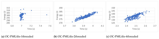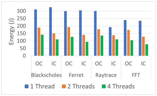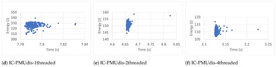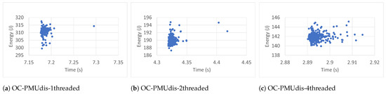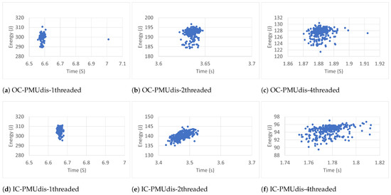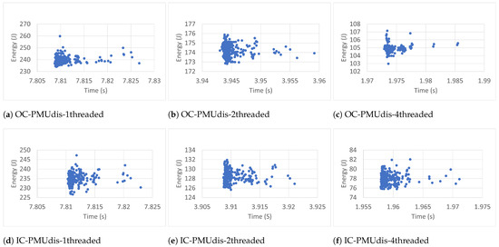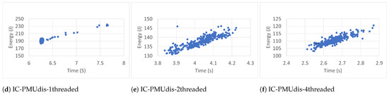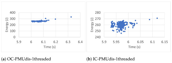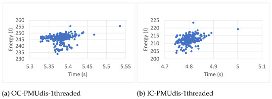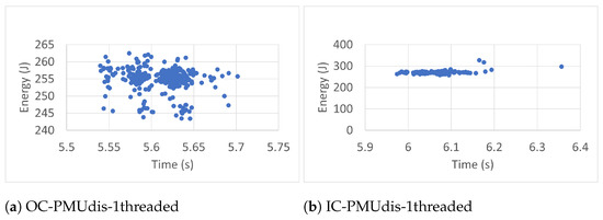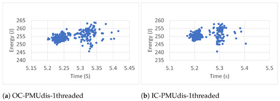 Each workload ran three hundred (300) times. The experimental results revealed that more runs did not contribute to the convergence of the average. The workloads ran with one thread (1T), two threads (2T), and four threads (4T). In each case, the benchmarks were executed inside (IC) and outside (OC) Docker containers. The collected data included execution time (ET), energy (E), task clock (TC), executed instructions (#inst) and branches (#Br), branch misses (BrM), last-level cache store (LLCS) and load (LLCL), last-level cache misses (LLCM), context switches (CS), CPU migrations (CPUM), and page faults (PF). The researchers chose these events because of their direct impact on energy [40]. The data were also collected (outside containers) in two general cases: when the Power Management Unit was enabled (PMUen) and when the Power Management Unit was disabled (PMUdis).
