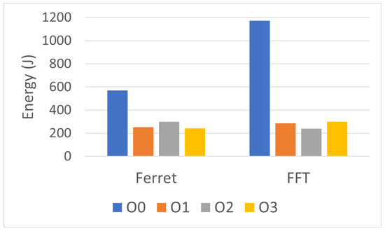To measure the effect of compiler optimization on RAPL measurements, two benchmarks, Ferret and FFT, were compiled with the four main GCC compiler optimization level options, namely, O0, O1, O2, and O3, which range from minimal optimization (O0) to aggressive optimization (O3). The experiments also tested the sensitivity of RAPL to the CPU’s ambient temperature by covering the upper side of the computer case with a mask with small holes. The rest of this section discusses, in detail, the results and the different scenarios used to obtain them.