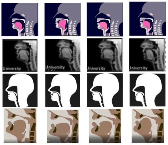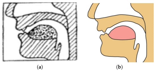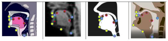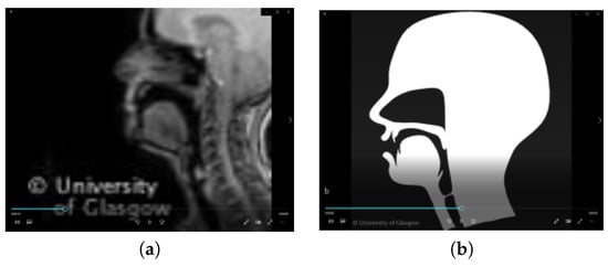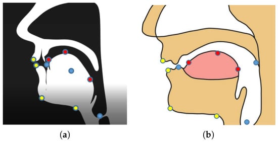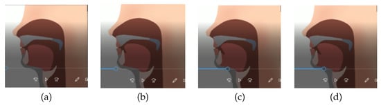 Some articulatory animations currently exist. We mainly collected three datasets: the animation dataset from Glasgow University in the UK [], shown as Figure 1; the dataset from the University in Canada (UBC) []; and the dataset from SpeechTrainer in Germany. Each of the above animation datasets has its own animation style. However, we found that, in practical applications, people’s needs for animation styles vary. Some textbooks need cartoon animation styles, some videos need medical-style animation, and some need 3D style animation. To meet these different requirements, our method involves creating a picture of the target style and then selecting the existing driving animation so as to obtain the articulation animation in a new style. Of course, the auto-generated articulatory animation will not be perfect and will need to be manually fine-tuned, but it can greatly reduce the human workload. In addition, our system can also form syllable animations with vowels and consonants and then form word animations and sentence animations. Vowels and consonants drive the acquisition of animations, and ultrasonic images of vowels and consonants were obtained through various resources, as well as some animation images made by previous workers. Here, we need to see that the MRI image is complete and the manually drawn image is incomplete. Figure 2 shows the publicly used standard articulatory image and the decorated articulatory image drawn by our team.