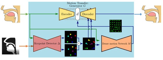 Inspired by former research [,,], we designed a motion migration model using artificial intelligence to realize style migration for articulation animations. There are two main tasks. First, the driving video is an MRI image, and the target image is a beautiful, manually drawn standard tongue image. The second step is to form a similar animation with the beautiful tongue image driven by MRI animation and then to form a clear and beautiful animation of the causal consonant pronunciation through a small amount of manual processing by artists.