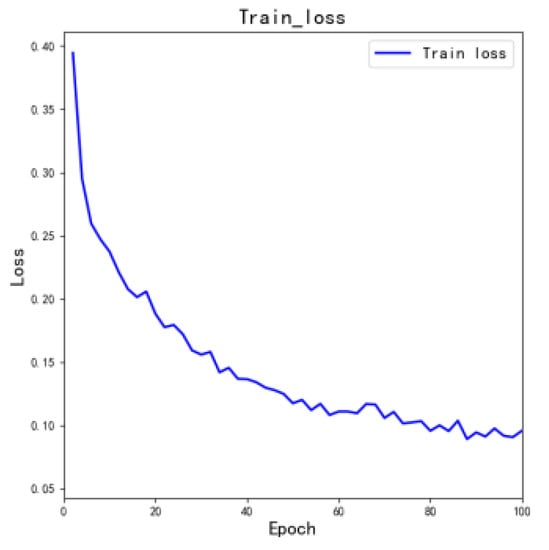 Before the formal training of the model, we downloaded the pre-trained model. As the number of samples was small and the results of training images from scratch are poor, our main training work was in optimizing the pre-trained model. In the process of model optimization, it was necessary to reasonably set the initial values of the parameters. The model was easier to train and tended to converge quickly. The batch size for network training was set to 24, and the total number of training epochs was set to 100. The learning rate of the model decreased with the increase in the number of training epochs. The model training curve is shown in Figure 7.