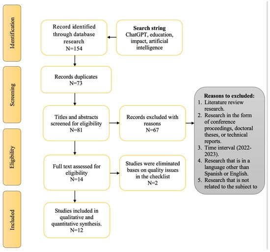 The selected databases were Web of Science, Scopus, and Google Scholar. The search string (Table 1) was applied in the three international databases in the field of education, in the fields of title, abstract and/or keywords. The literature search was conducted between May and June 2023, with an initial identification of 154 records.
