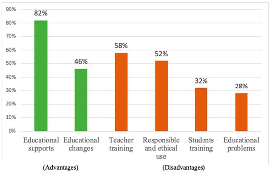 Considering the main findings that were found after reading the selected articles, Figure 4 shows that the main result obtained was that the use of ChatGPT in education is a great educational support in the teaching and learning process for both students and teachers (82%). This is closely linked to the improvement of performance, motivation, organization and efficient time management, as well as the promotion of a more effective and collaborative learning environment. At the same time, there is a lack of teacher training regarding the use of ChatGPT for its subsequent application and use in educational classrooms (58%), as many teachers do not have the necessary skills to apply it efficiently. However, it is necessary that all educational agents know how to use this tool in a responsible way, following ethical guidelines, since inappropriate use could be an obstacle in the learning process of students (52%). On the other hand, and closely related to the previous finding, a large part of the research collected in their articles shows the great changes at the educational level that the use of ChatGPT can create by generating a strong impact on the way of teaching and carrying out tasks (46%). Lastly, the articles reflect a concern for the clear need for student training (32%) and the possible problems in the educational system that can be generated after prolonged use of this application (28%).