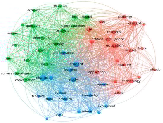After conducting an analysis using the VOSviewer software, a bibliometric analysis was performed to visualise research trends in relation to the use of ChatGPT in education. This analysis revealed three clusters grouping the keywords present in the titles and abstracts of the studies found in the databases, allowing us to identify three main emerging research areas and the directions that the research in this field is taking.