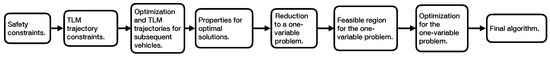 The progression of this section is captured by Figure 1. We start by defining what safety means in this context. We continue by defining the trajectory constraints for a vehicle during TLM. Then, in Section 4.1, we first introduce the optimization objective in (2) and then the explicit trajectory constraints for subsequent vehicles in (3) and (4). We proceed to study the properties of the optimal solutions in Section 4.2. Then we show how the optimization problem can be reduced to a problem involving only one variable in Section 4.3. Then we find explicit expressions for the feasible region of the one-variable optimization problem in Section 4.4 and Section 4.5. Then we introduce the optimization procedure for the one-variable problem in Section 4.6. Finally the results are summarized in Algorithm 1 in Section 4.7.