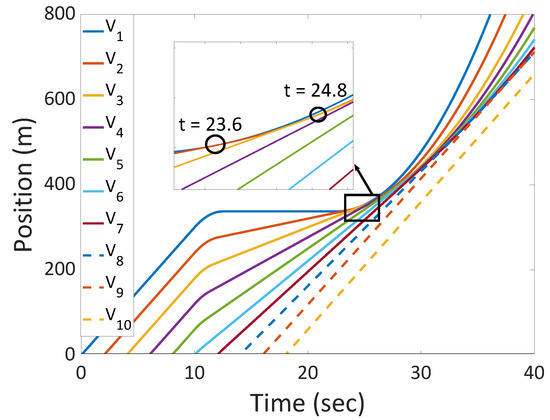 Figure 5 shows that using the proposed algorithm, vehicles can slow down and accelerate again safely. It is worth noting here that the touch point between consecutive vehicles occurs sequentially such that, for example, the first and second vehicles, denoted by , touch at around while the second vehicle and the third one, , touch at around . This shows that the algorithm can scale well to situations where the idle duration of the first vehicle is longer.
