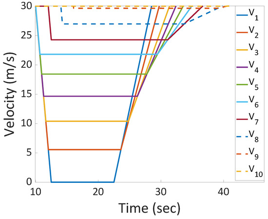 Figure 6, on the other hand, shows the evolution of the vehicles’ velocities over time, starting from the moment the first vehicle starts decelerating. It can be observed that while the first vehicle decelerates to a velocity of , the rest of the vehicles decelerate and then move with a constant velocity before accelerating again. It is also depicted in the figure that vehicle keeps driving with the same speed and does not need to use the proposed optimization procedure.