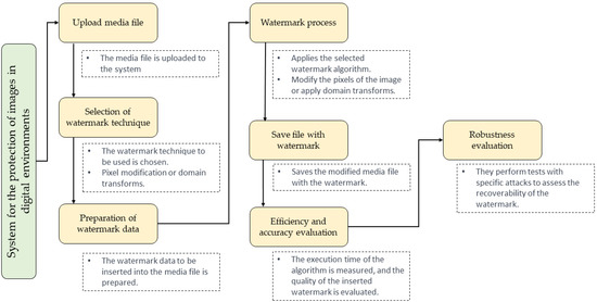 During the implementation process, different techniques have been used to insert watermarks in multimedia files, such as images. These techniques include pixel modification, adaptive pixel modification algorithms, and domain transforms, such as the Fourier transform [27]. At the spatial domain watermark insertion stage, the Pillow library loads the image, creates a copy, and then adds the watermark text in the upper right corner using the draw function text().