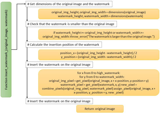 In Figure 2, the pseudocode of the proposed algorithm for the insertion of watermarks in images is presented. In the pseudocode, the insert_watermark_function takes as its input the original image and the watermark to be inserted. The watermark is verified to be smaller than the original image to ensure it can be inserted without significantly distorting it. Then, the watermark’s insertion position in the original image’s center is calculated.