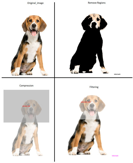 In Figure 4, the resulting image for each attack carried out is described, highlighting the specific characteristics of each one. In the case of the “Remove Regions” attack, the resulting image no longer bears the watermark. However, it is noted that the regions where the watermark was located have been removed and replaced by black pixels. This causes a drastic change in the image’s appearance, as the removed areas become entirely black. In the “Compression” attack, the image has been resized due to the compression process. This means that the resulting image may be smaller in dimension compared to the original image. This size change can alter the image’s visual perception and affect the quality of the details. In the case of the “Filtered” attack, the resulting image is slightly blurred. Although the blurring is subtle, a loss of detail and decreased sharpness of edges can be observed. This blurriness results from the filtering process applied to the image, which softens the pixels and reduces the definition of the details.