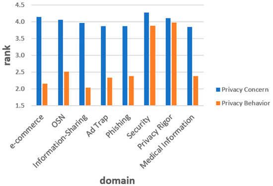 The average Privacy Concern vs. the average Privacy Behavior of all participants for each domain is depicted in Figure 2. The X-axis describes the different domains, while the Y-axis describes the levels of privacy concerns (blue bars) and privacy behavior (orange bars). For each domain, a paired two-tailed sample t-test was conducted to evaluate if there are differences. There were significant differences between the privacy concern and behavior in all domains: e-commerce, privacy concern SD = 0.75) vs. privacy behavior SD = 0.81); . OSN, privacy concern SD = 0.81) vs. privacy behavior SD = 1.40); . Information-Sharing, privacy concern SD = 0.88) vs. privacy behavior SD = 0.83); . Ad Trap, privacy concern SD = 0.87) vs. privacy behavior SD = 1.17); . Phishing, privacy concern SD = 0.87) vs. privacy behavior SD = 1.22); . Security, privacy concern SD = 0.82) vs. privacy behavior SD = 0.92); . Privacy Rigor, privacy concern SD = 0.83) vs. privacy behavior SD = 0.90); . Medical Information, privacy concern SD = 0.92) vs. privacy behavior SD = 1.08); .