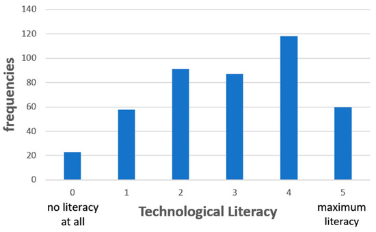 The distribution of technological literacy SD = 1.42) is depicted in Figure 3, where the X-axis describes the technological literacy level, while the Y-axis describes the frequencies of the technological literacy level among the empirical study population.