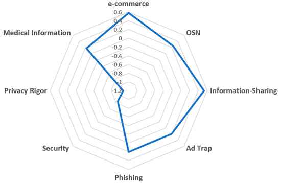 Given the raw matrix of the results (privacy concerns and privacy behavior for each domain and for each participant), the matrix (the paradox’s magnitudes for all the individuals and for all the domains) was calculated, and the index (the average of the paradox magnitude across all the domains for a specific individual ) was determined for each participant. Now, the deviation of each domain for each participant can be calculated. The average of across all participants is given by: , and depicted in Figure 4. The deviation of each domain is a measure of its uniqueness, indicating how specific it is. Therefore, this figure provides a visual illustration of the answer to the research question. The scale on the chart’s radius (the distance from the center) indicates the level of domain specificity. For example, it can be noticed that e-commerce has a high domain-specific value, Ad Trap has a middle value, and Security a low value.