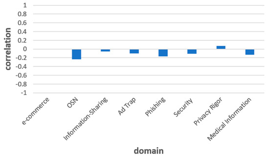 As mentioned above, the gap between privacy concerns and behavior, i.e., the privacy paradox, might be explained by limited technological literacy [24]. A true paradox exists if users, while understanding the implication, act in a direction opposite to their personal preferences. Therefore, the technological literacy factor may be accommodated in the model as a necessary condition for the existence of a paradox (rather than an explainable gap between privacy concern and privacy behavior). That said, we hypothesize that when technological literacy is low, the paradox does not really exist, because the individual cannot efficiently enact their preferences (reflecting privacy concern) by making adequate decisions and acting appropriately (reflecting privacy behavior). Consequently, the question of domain specificity has less significance. To measure the technological literacy effect, the Pearson correlation coefficient between each paradox level of a specific domain and the literacy level was calculated, as depicted in Figure 5. The X-axis describes the domain, while the Y-axis describes the correlation. As can be seen, the correlation coefficients vary from −0.23 to +0.07, which is not significant. Therefore, technological literacy cannot settle this paradox, which is proven to exist.