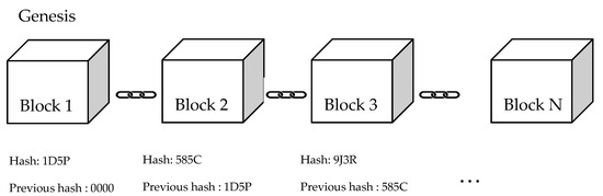 Blockchain is a series of blocks connected with a hash function (SHA-256) without any central authority. Blocks are added after a miner confirms the hash in any given block; the block is added to his blockchain and the updated version of the blockchain is broadcast to other miners on the network. Other miners validate the hash and add it to their blockchains and any blocks that cannot be validated are discarded [13]. Therefore, tampering with the block value will change the hash in the blocks, and eventually, it will be discarded. The connection of blocks is shown in Figure 1.The first block in a blockchain is called a Genesis block. Each block contains a hash calculated from the contents of the block and the previous block’s hash value [14].