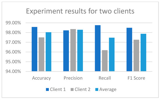 The results for the two clients are considerably above 97% in terms of accuracy, precision, recall, and F1 score. These results are high considering that privacy is preserved by implementing federated learning given in Table 6 and Figure 4.