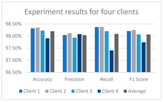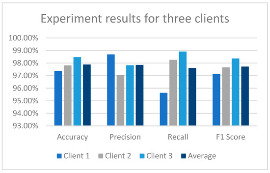 When we repeated the experiment using three clients, the results remained above 97% in terms of accuracy, precision, recall, and F1 score given in Table 7 and Figure 5.