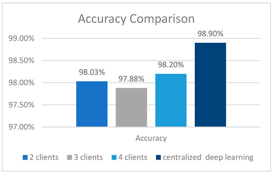 In terms of FL results, we compared our results with a centralized ML using the same dataset [27]. Figure 7 shows a comparison of the accuracy of deep centralized learning and federated learning using the same dataset.
