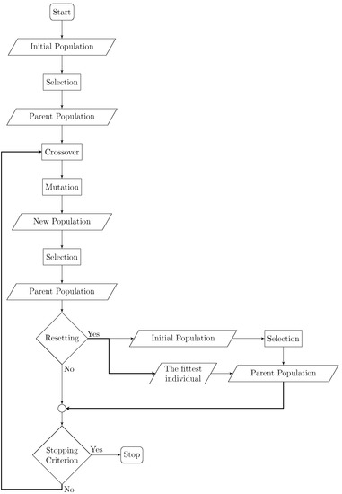 As the last stage of the loop, to provide additional diversity to the parent population, we apply a resetting step that is a slightly modified version of the one suggested in [22]. An optional resetting step is applied in [22], which keeps the fittest individual and randomly generates the remainder of the parent population if there is no improvement in the best fitness value for a number of generations. Here, we apply the resetting step by considering the fitness values of all individuals in the parent population of each generation. More specifically, if those values are the same for a generation, then one of them is kept, and the other 39 individuals are generated by forming a new population of size 1000 randomly and then applying the selection operation to them. Moreover, in this step, the GA outputs the fittest individual within the parent population of the current generation. The loop continues until the stopping criterion is met, which is the maximum number of generations, and, throughout our experiments, it varies between 100 and 20,000.